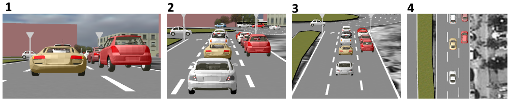 Durante uma simulação, ou reprodução de uma simulação, você pode clicar em qualquer veículo na visualização 3D para colocar uma câmera temporária atrás dele. Essa câmera segue o veículo durante a simulação até que ele deixe a rede.