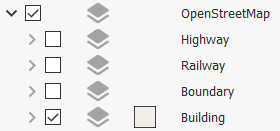 Ao importar um arquivo OpenStreetMap, algumas imagens 3D, por exemplo, árvores, são automaticamente criadas e colocadas nas camadas nomeadas Natural e Uso do Solo. Neste exercício, criaremos objetos manualmente: primeiro uma árvore e depois uma entrada de estacionamento para nosso novo edifício. Os passos e métodos são relevantes para todos os objetos 3D disponíveis.