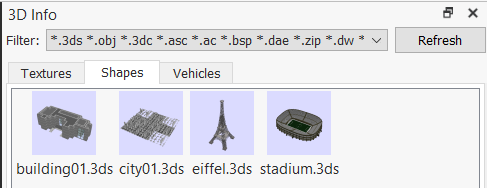 Antes de começarmos, copie este arquivo para a pasta .../shapes e clique em Atualizar na janela Informações 3D para que ele apareça na lista, como abaixo (à direita).